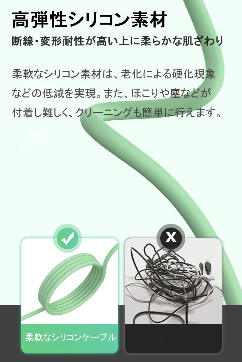 ・iPad mini 充電ケーブル・詳細情報・赤ちゃんのおしゃぶりにも採用している高品質液体シリコーンゴム採用のケーブルが登場。表面はしっとり手になじみやすく色落ちがなくムラもない。上品で飽きの来ないカラー配色でその日のコーディネートや気分に合わせられる。