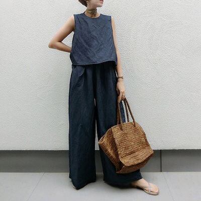 涼しく楽ちんセットアップ綿麻トップ+ワイドレッグパンツ2点セット