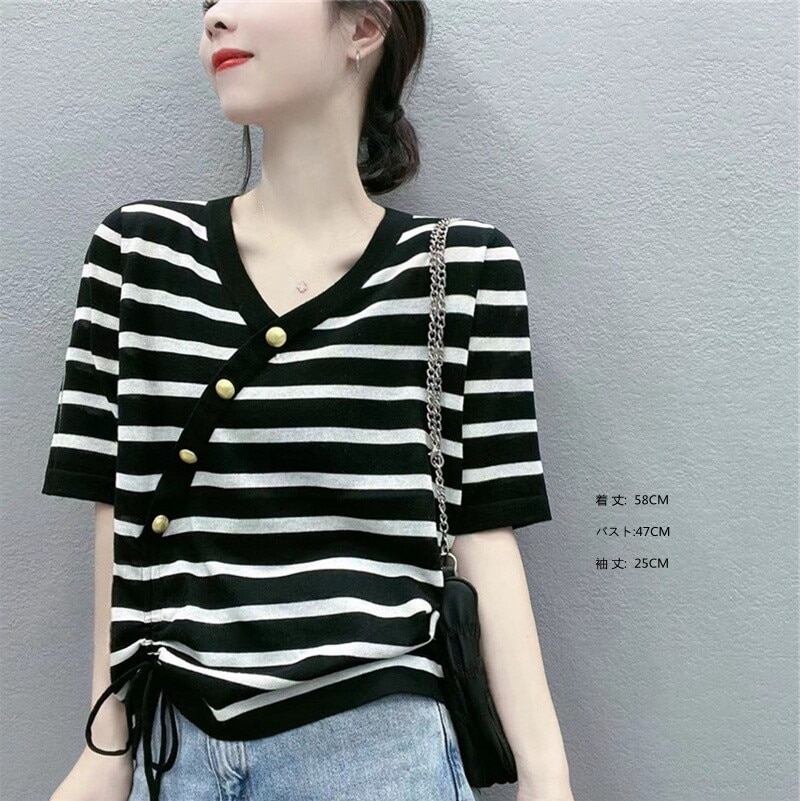 可愛い減齢Tシャツ半袖ストライプシャツクルーネックトップスColor: ホワイト ブラック
