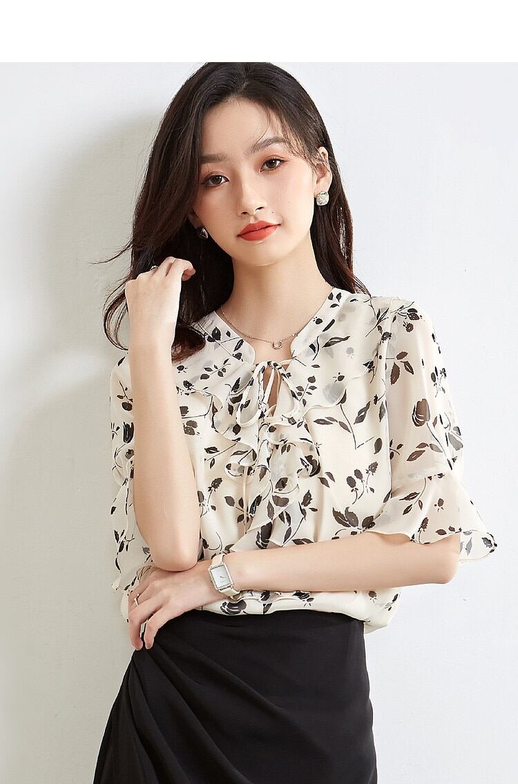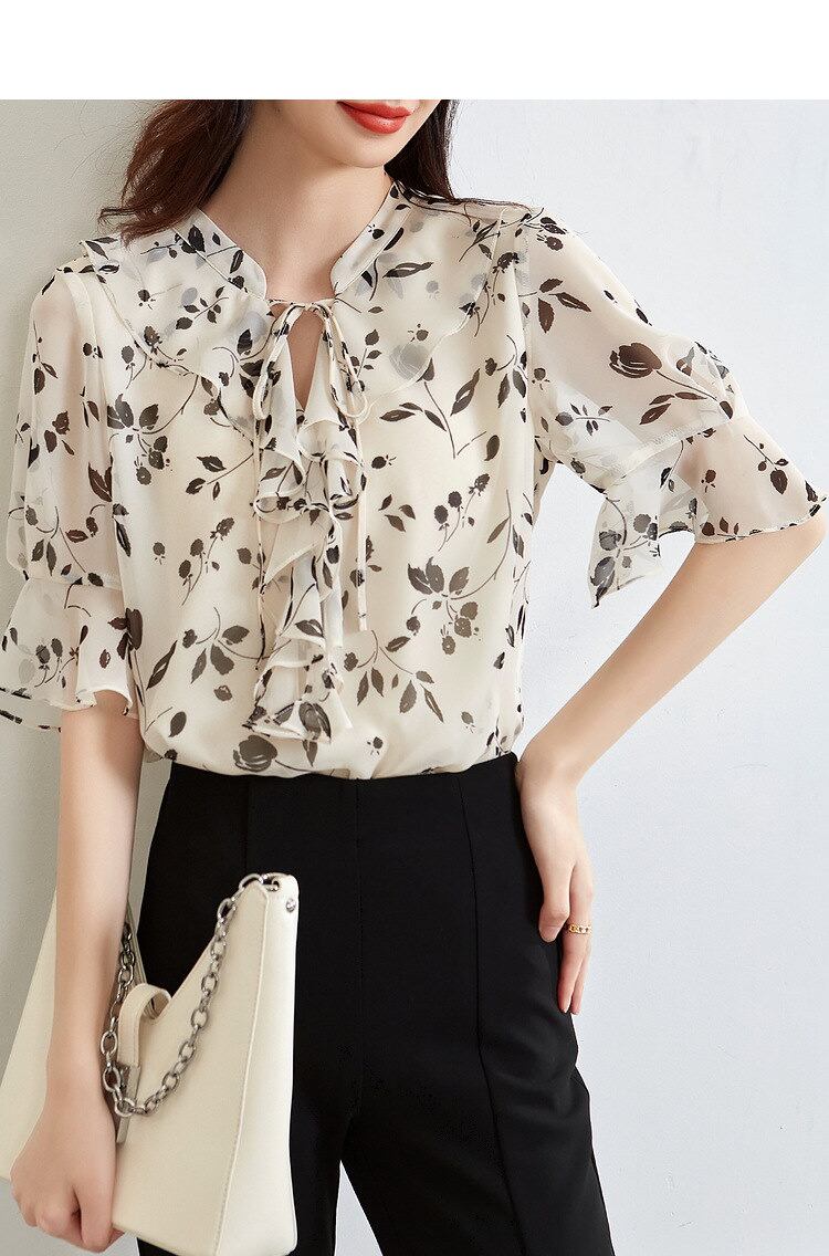 気質OLトップサマー新商品蓮の葉プリントシフォンシャツ半袖体型カバーチュニックシアーシャツブラウスSize: S M L XL 2XL