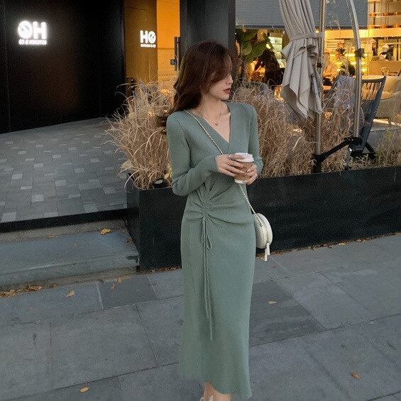ウエスト引き締めおしゃれでかわいいニットボトムワンピース春夏ミディアムファースカートにコートニットワンピース冬のワンピースColor: ピンク グレー グリーン ブラック コーヒー色 杏色 Size: s m l xl