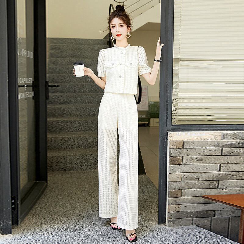 Tシャツワイドパンツセットアップ気質通勤レディース 女性 制服おしゃれ ジャケット2点セット韓国ファッションColor: ブラック ホワイト Size: S M L XL 2XL