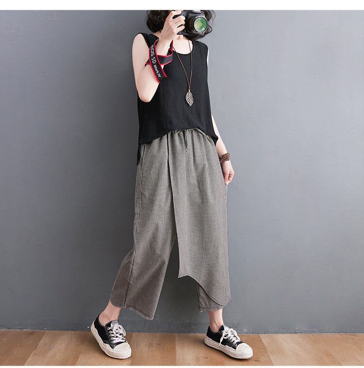 キュロットパンツ リネン 八分丈 袋付き ゴムウエスト ワイドパンツ レイヤード 細チェック 春夏 綿麻 レディース キュロットスカート風 パンツ ドッキング スラックス フレアサイズ: L(50-65KG) XL(65-80KG) XXL(80-95KG)