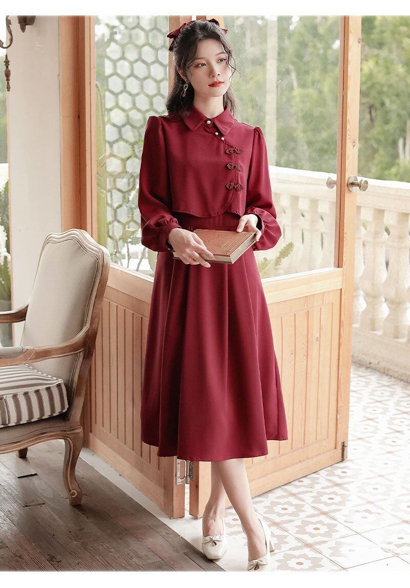 古風 ワンピース レトロ 中華風 チャイナドレス 偽2セット Aライン スウィート レディースワンピース 日焼け止め ロングワンピースColor: アプリコット(人気) ワインレッド(人気) ライトグリーン「高品質版」 アプリコット「高品質版」 ワインレッド「高品質版」 Size: S M L XL