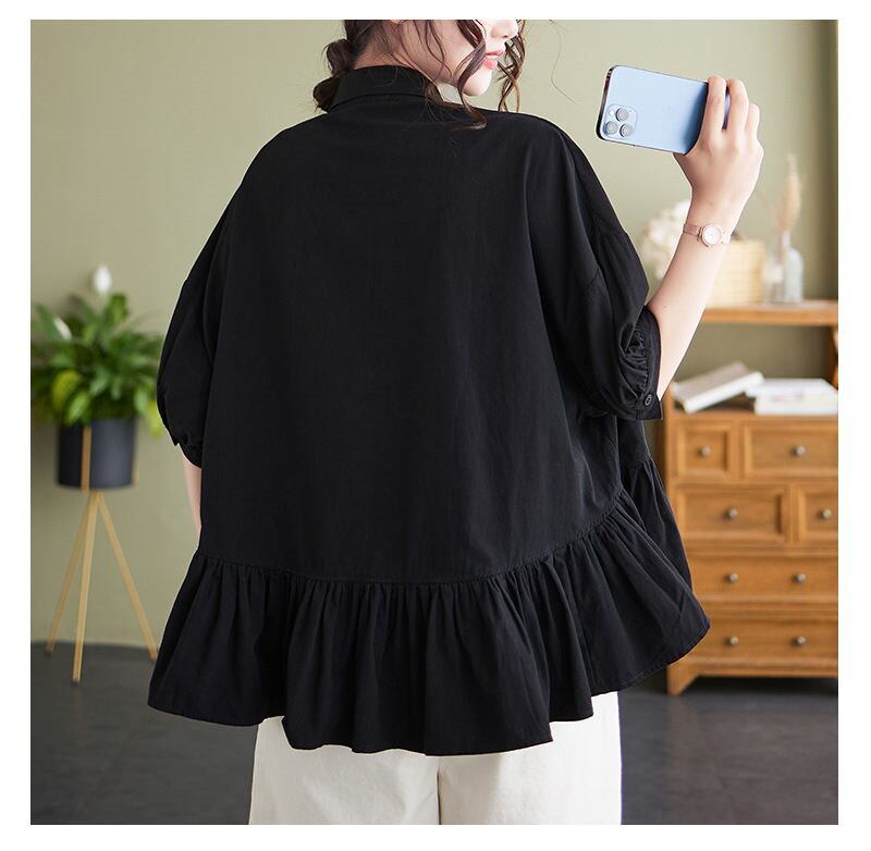 ブラウス シャツ 日焼け止め UVカット フリル 皺風 夏 薄手 半袖 不規則裾 レディースブラウスColor: ホワイト ブラック カーキ Size: M L XL 2XL