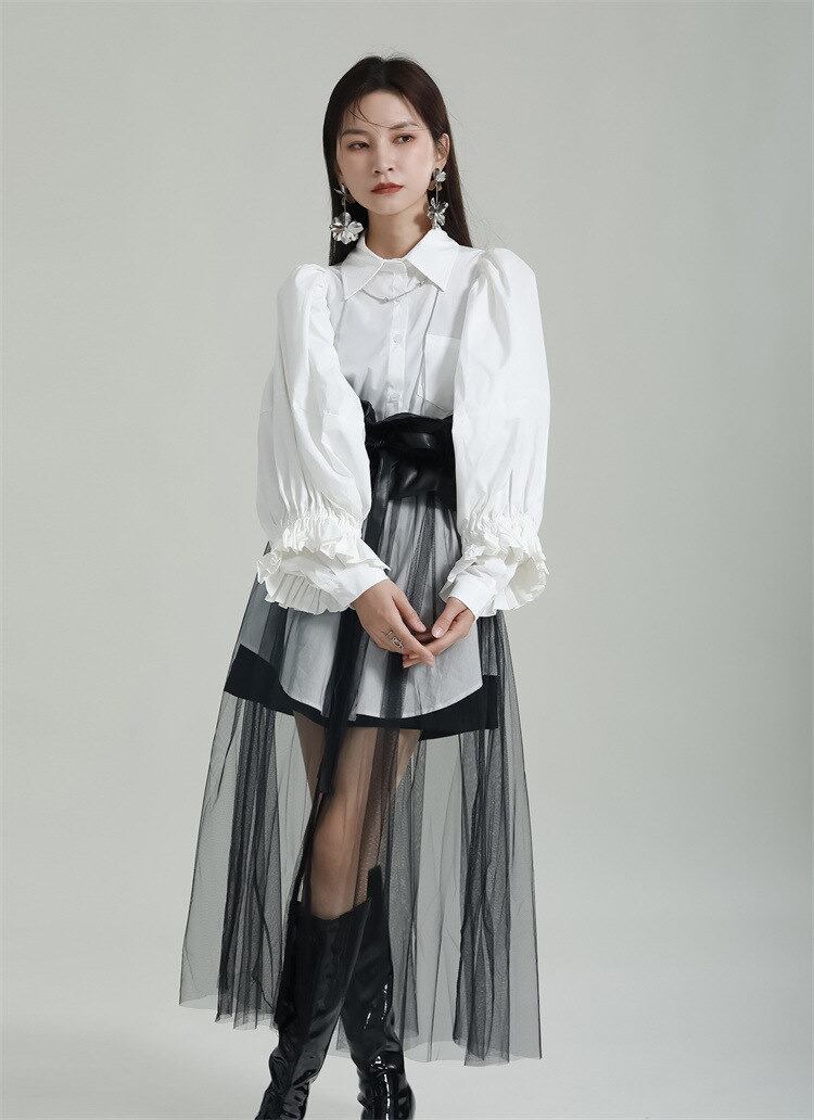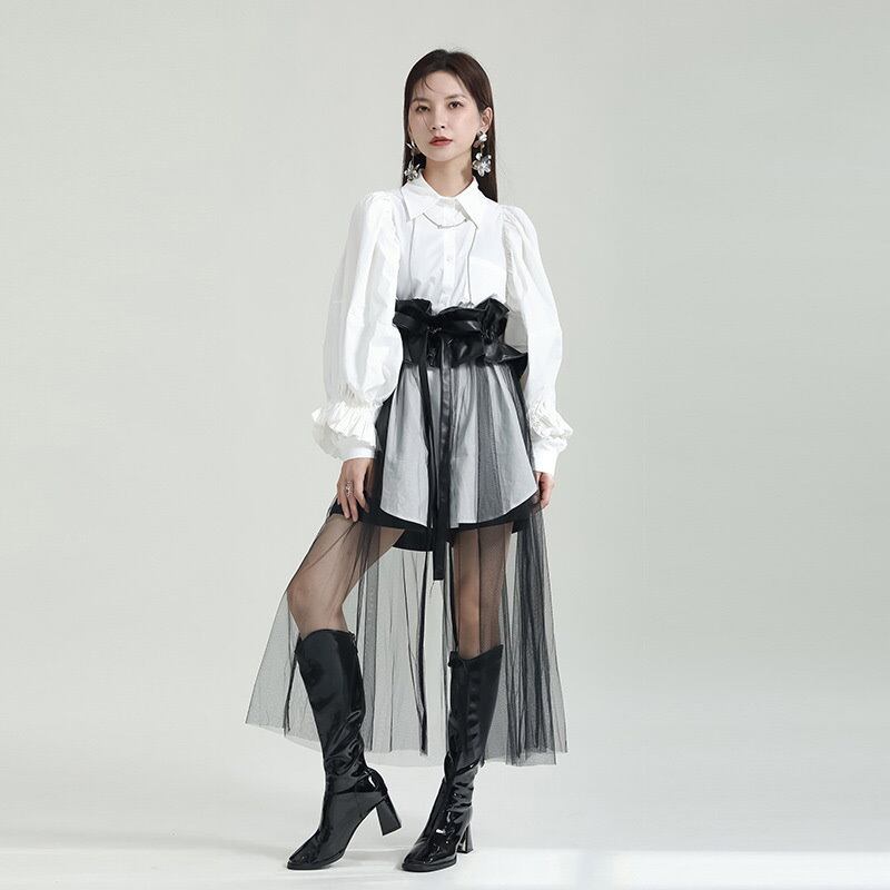 シルクスカート PUバンド ウエストバンド+チュールスカート 一体式飾りベルト ペプラムスカート ドッキングスカート レディーススカートColor: ホワイト ブラック