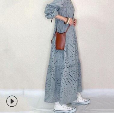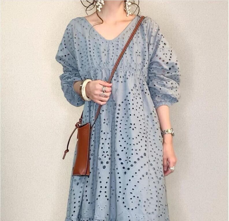 透かし雕り ワンピース レースアップ Vネック レディース ワンピ 日焼け止め ドレス ロングワンピース