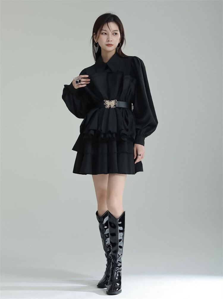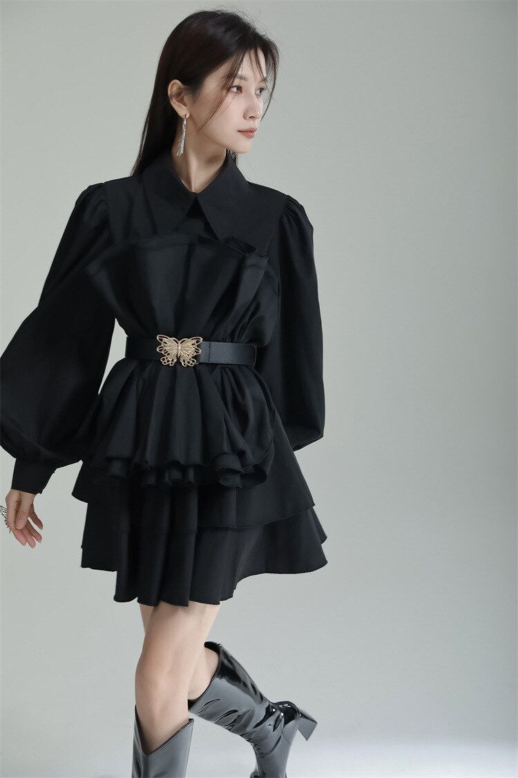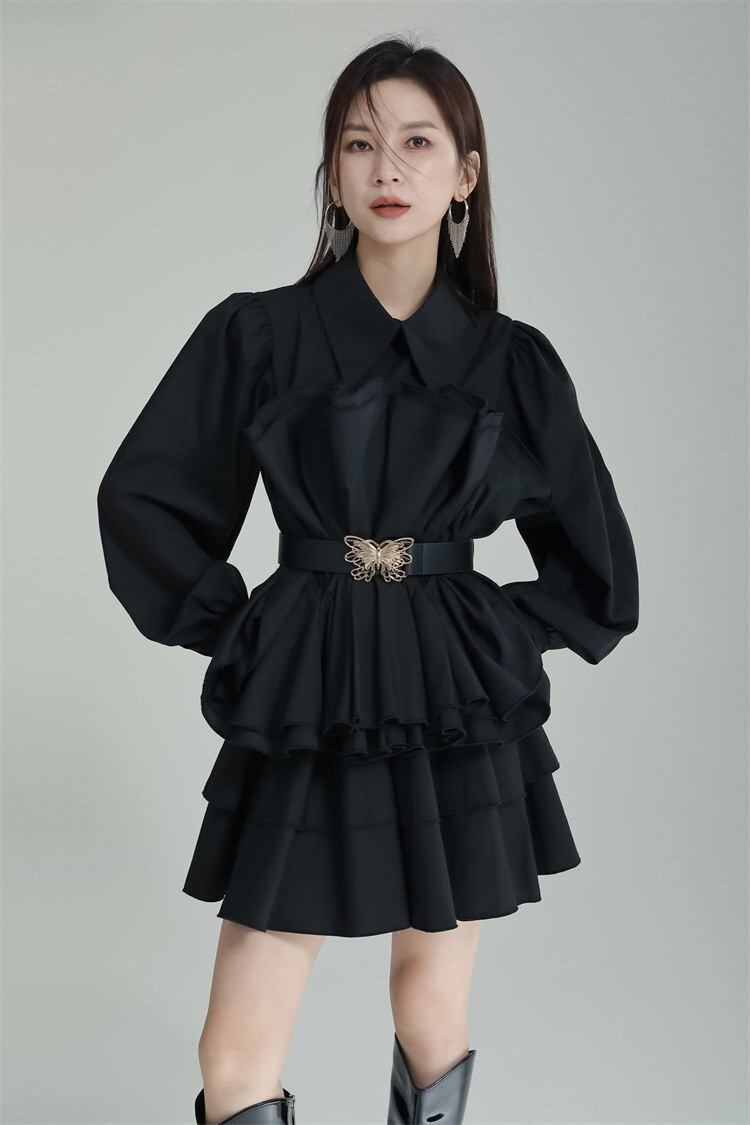 春 Aライン ショートワンピース 蝶ベルト付き フリル ケーキスカート プリーツ レディースワンピース 水陸両用 ラッシュガード 体型カバー 日焼け止め オールインワンColor: ブラック ホワイト Size: M L