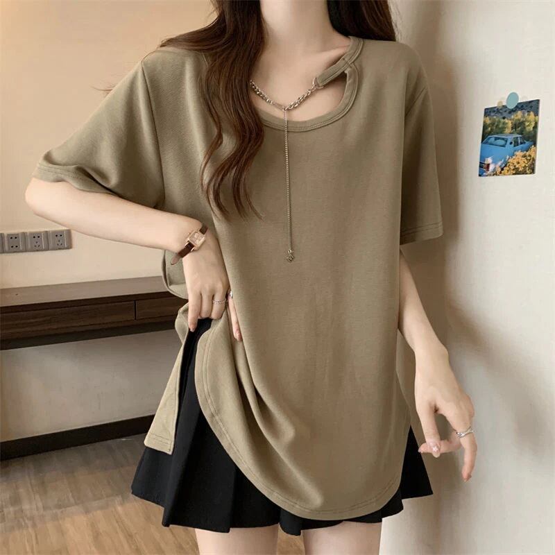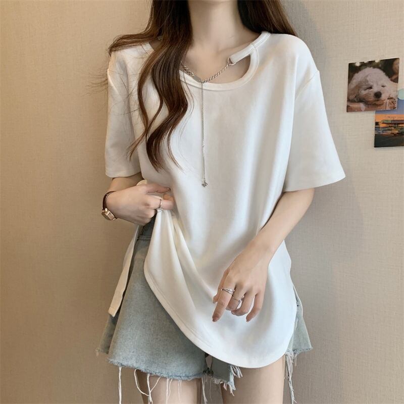 飾りチェーン付き Tシャツ 涼しい スリット 半袖 レディースTシャツ 夏 2023 韓国ファッションゆったり着やせ チェーントップス