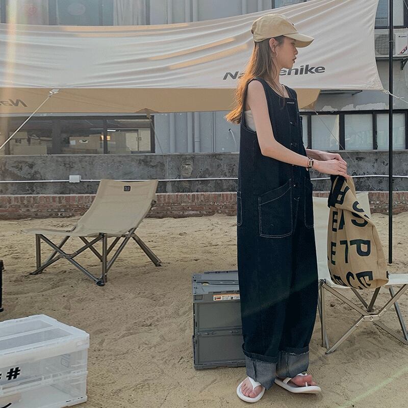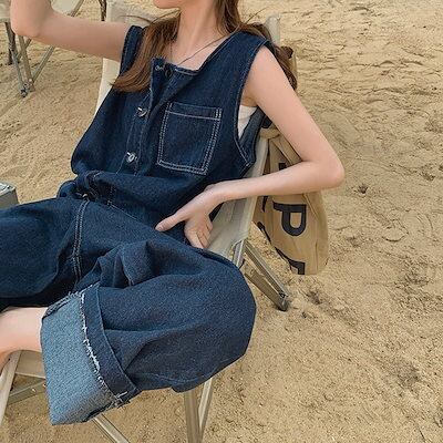 デニム オールインワン リラックス雰囲気 ジャンプスーツ オーバーオール サロペット ワイドパンツ ストレート ノースリーブ ゆるダボ ゆったり カジュアル 韓国ファション フレンチ