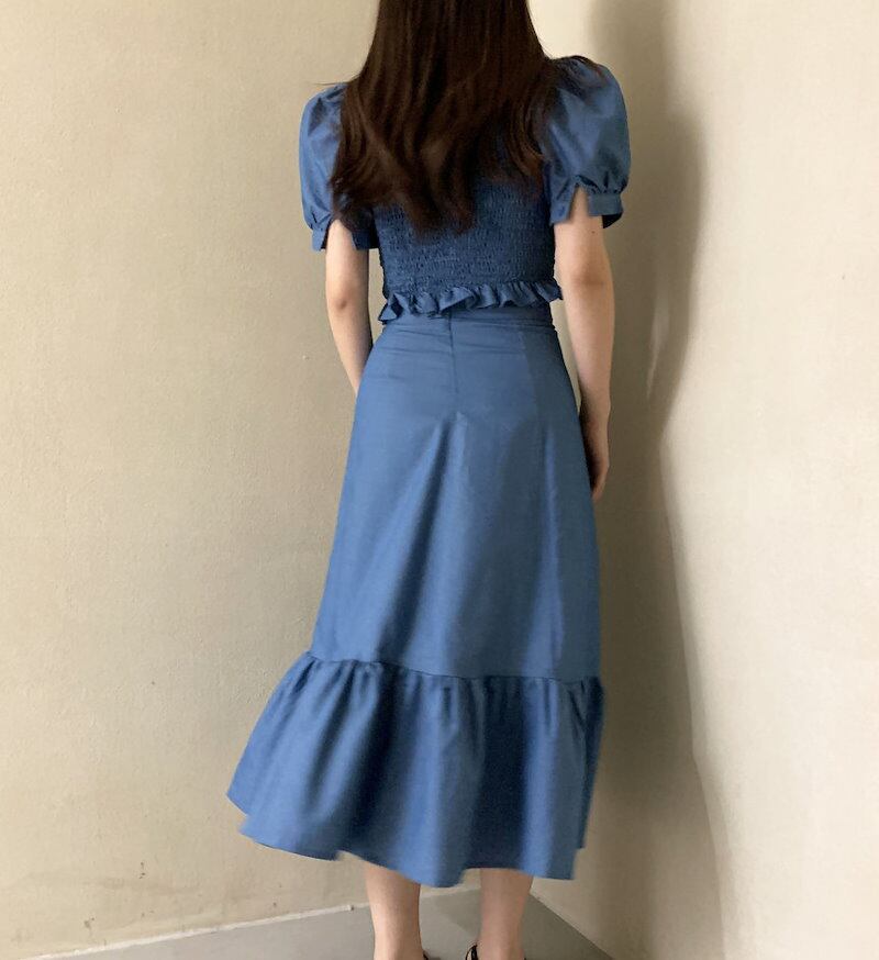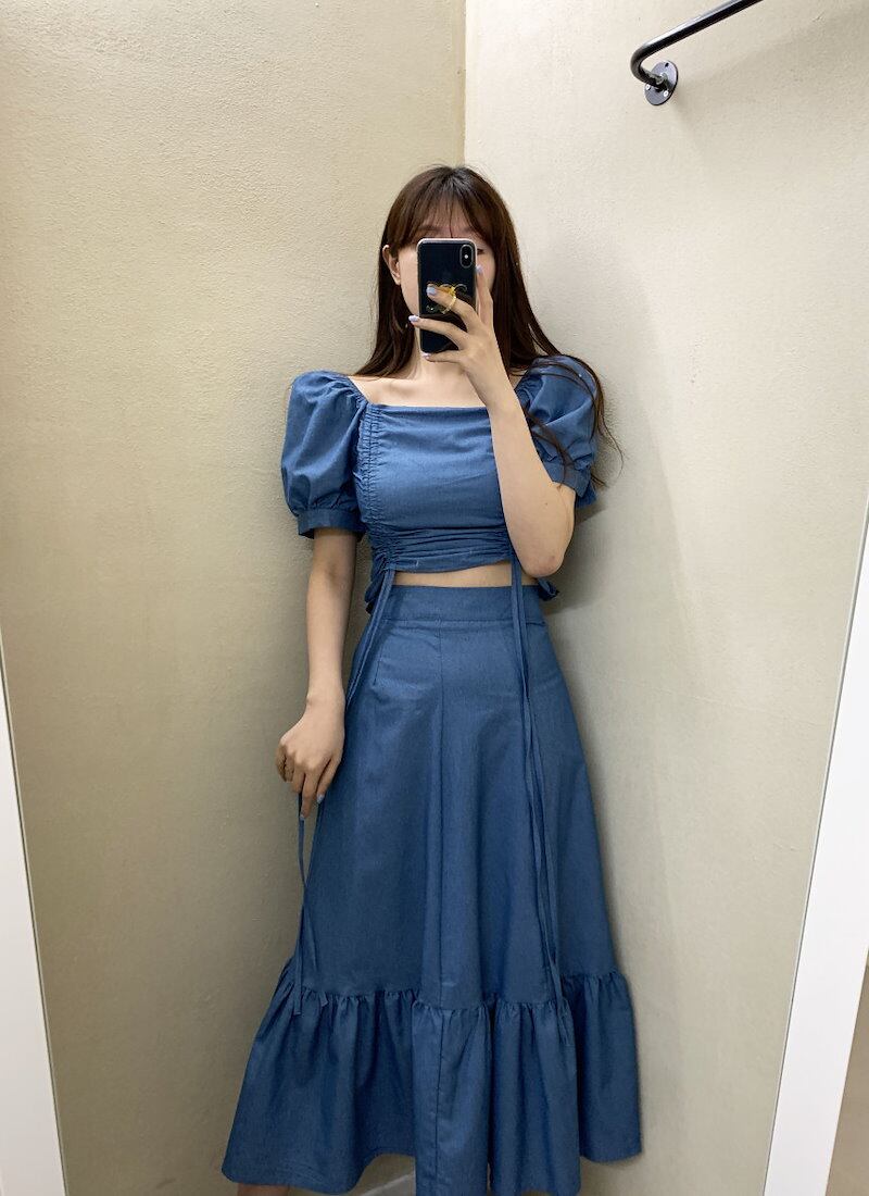 可愛いデザイン 2色 デニムセットアップ レディース トップス+スカート 韓国ファション 巾着 着痩せ ワンピース風 セットアップ 上下セット
