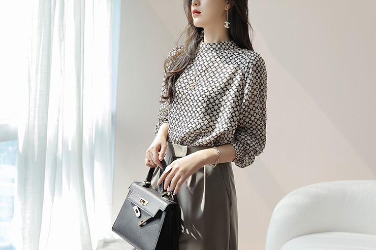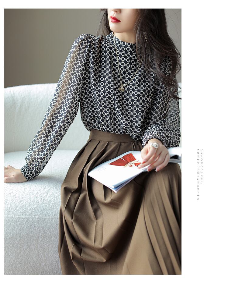 スカートに似合う チェック柄 ひんやり シフォンブラウス 夏 柄ブラウス ハイネック ソフト シルク シャツ 冷房対策 長袖 日焼けとめ