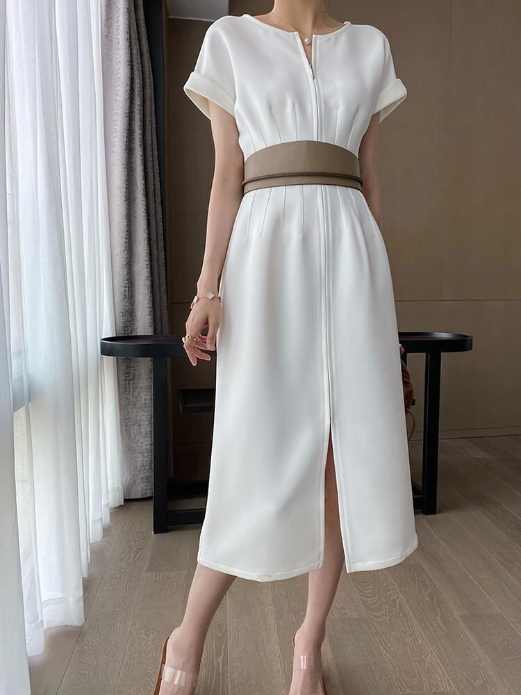 夏 着痩せ レディース ワンピース 引き締め 半袖 裾スリット 白 ロングワンピース