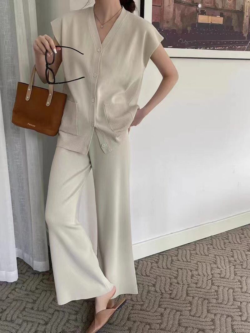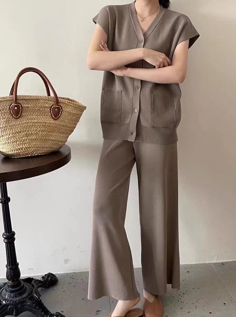 夏 セットアップ 薄手 ニット ノースリーブ レディース カーディガン+ワイドパンツ 上下セット