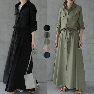 長袖 半袖 2タイプ 夏 ワンピース ポケット付き 開き襟ワンピース 大人 ロングワンピース レディースワンピース 新款 日系 セミロング カジュアル ワイシャツ 水陸両用