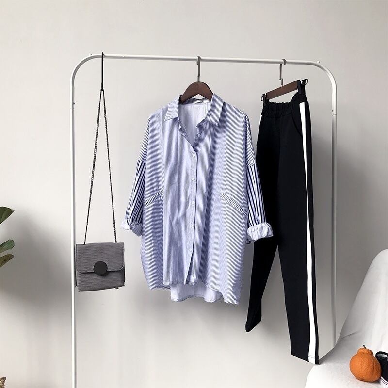 新しいストライプシャツ韓国版ルーズコート長袖カーディガンシャツColor: ブラック ブルー Size: M L XL