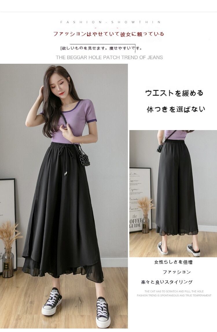 新しいプリーツシフォンワイドレッグパンツファッションスリムハイウエスト9ポイントキュロットColor: ブルー ブラック ホワイト ピンク Size: S M L XL