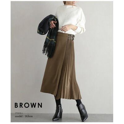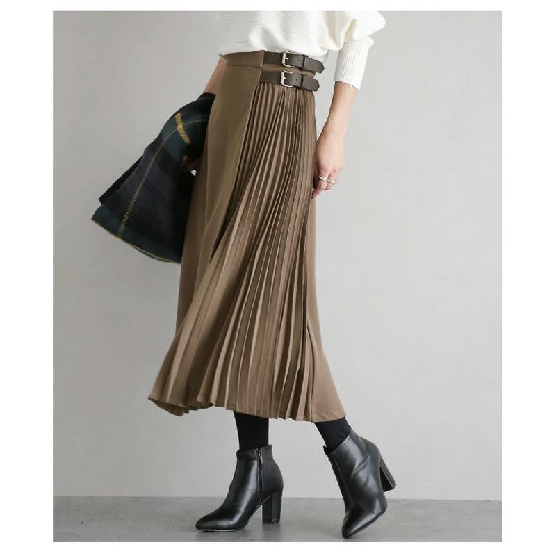 ダブルベルト プリーツロングスカート レディースColor: ブラウン ブラック パープル ネービー ベージュ Size: M L