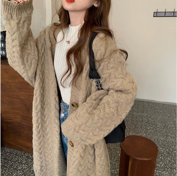 ニットカーディガン レディース アウター ロング丈 Vネック 羽織り ゆったり韓国秋冬Color: Khaki Black Coffee