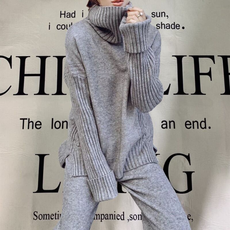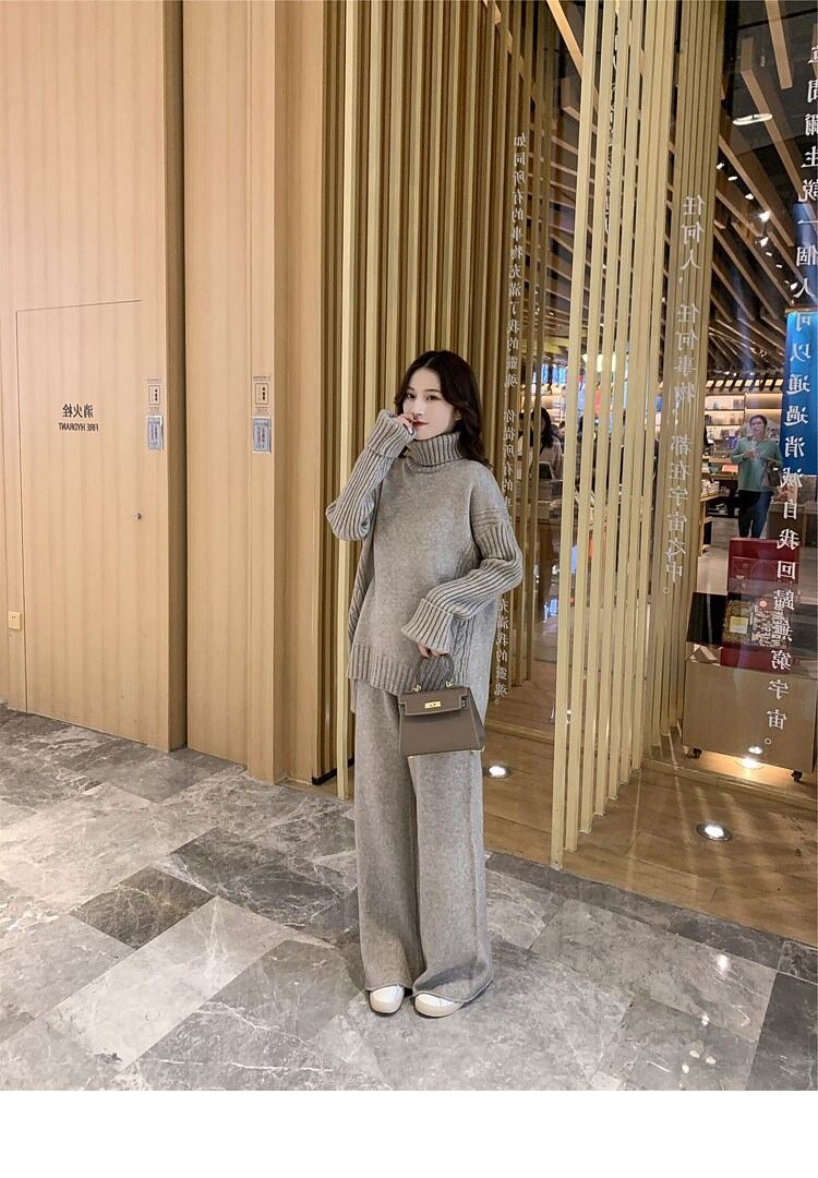 セットアップ 2点セットスウェット レディース ニット ワイドパンツ上下セットタートルネック セーター+ニット 秋冬長袖Color: Gray Black Yan Mai Pink-Purple Apricot Size: S M L XL