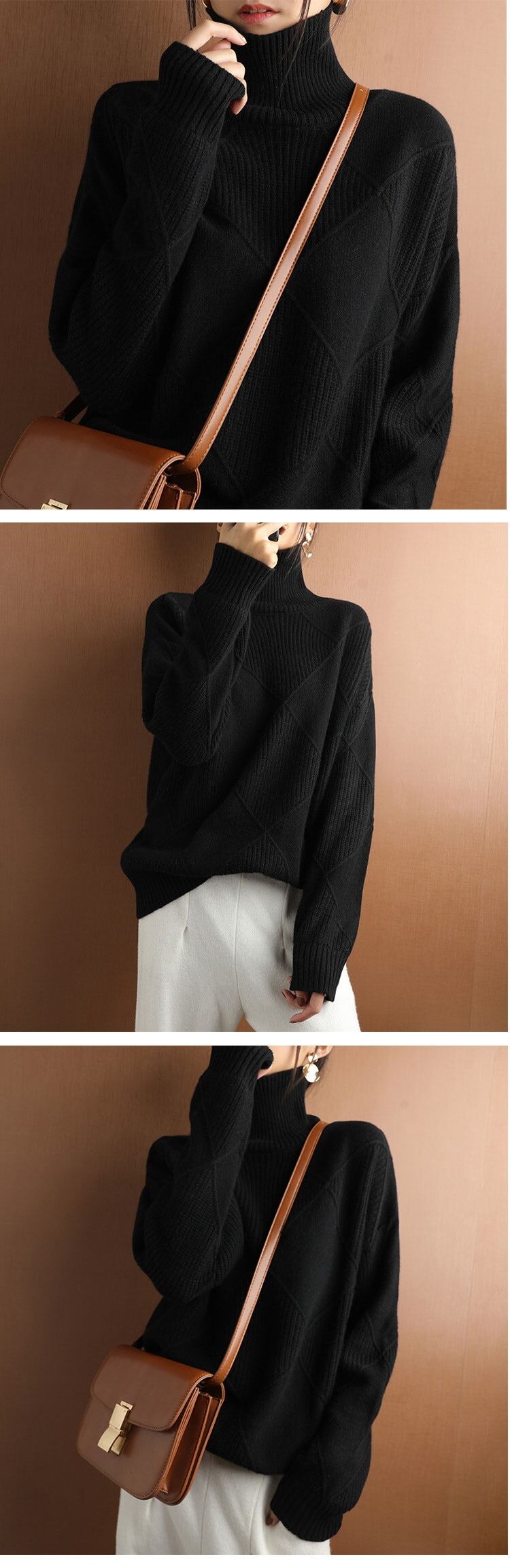 2022秋冬セータータートルネックヘッダーひし形セーター無地ゆったりプルオーバーColor: Khaki Yellow Gray Black White Green