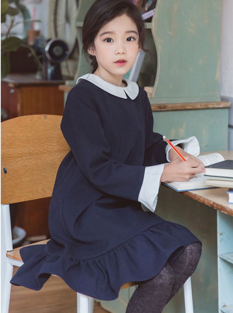 入園式 女の子 ワンピース フォーマル 白襟ワンピース 裾フリル 入学式 卒業式 法事喪服 ニューモダンスタイル ワンピース ネイビー お受験 面接 長袖 発表会 結婚式 お祝い キッズ 冠婚葬祭 春秋冬