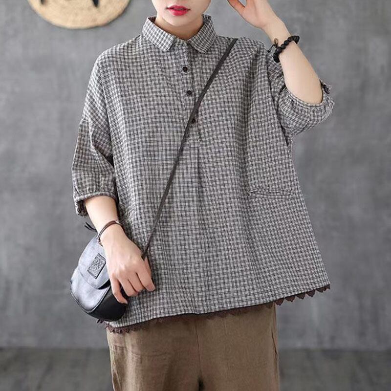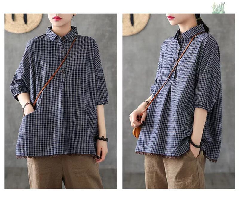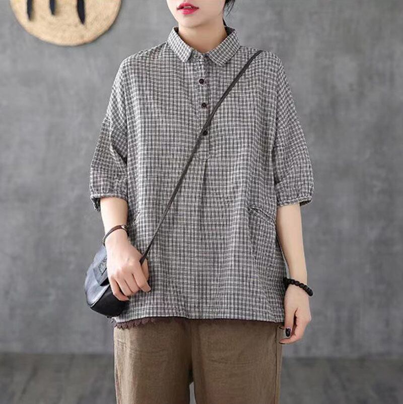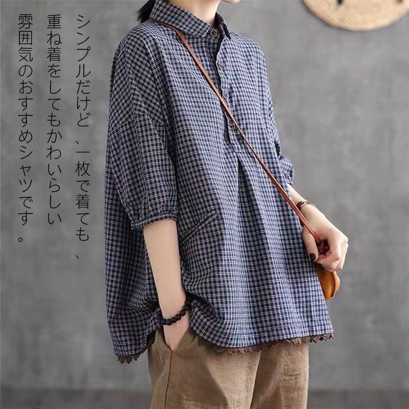 シャツ ブラウス 半袖 レディース リネン チュニック シャツ レディースTシャツ 綿麻 チェック柄 綿 入学式 通勤 通学 体型カバー フラットカラー 半袖 柔らか 綿 春 秋 カジュアル 体型カバ