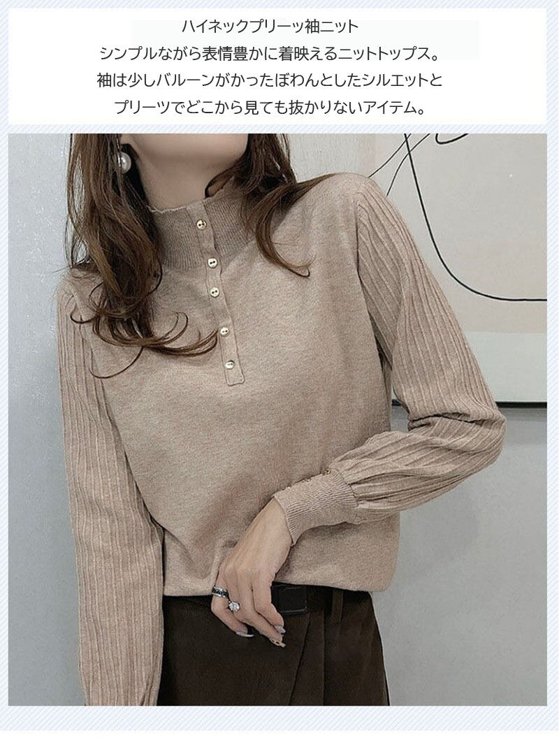 ハイネック ニット セーター レディース プリーツ トップス ニットトップス パフスリーブ 長袖 フリー ボリュームスリーブニット 襟ボタン 袖ボタン ボリュームニット 秋 冬 秋冬