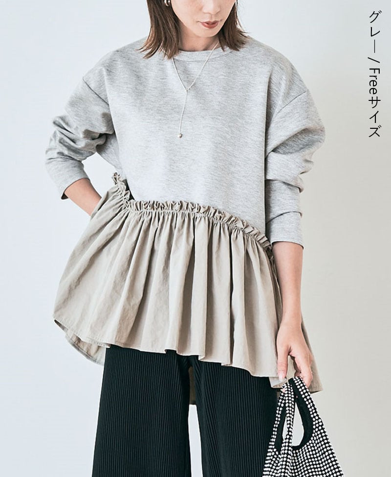 ロンT感覚でパッと着られて大人可愛いペプラムトップス 上品な生地にハリ感のあるナイロンを合わせた異素材デザイン