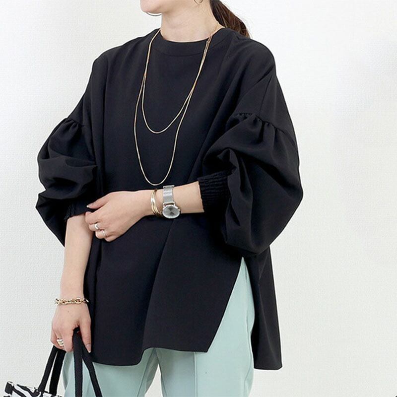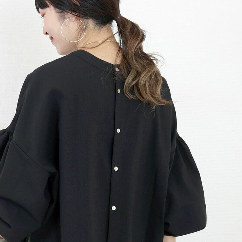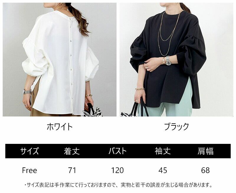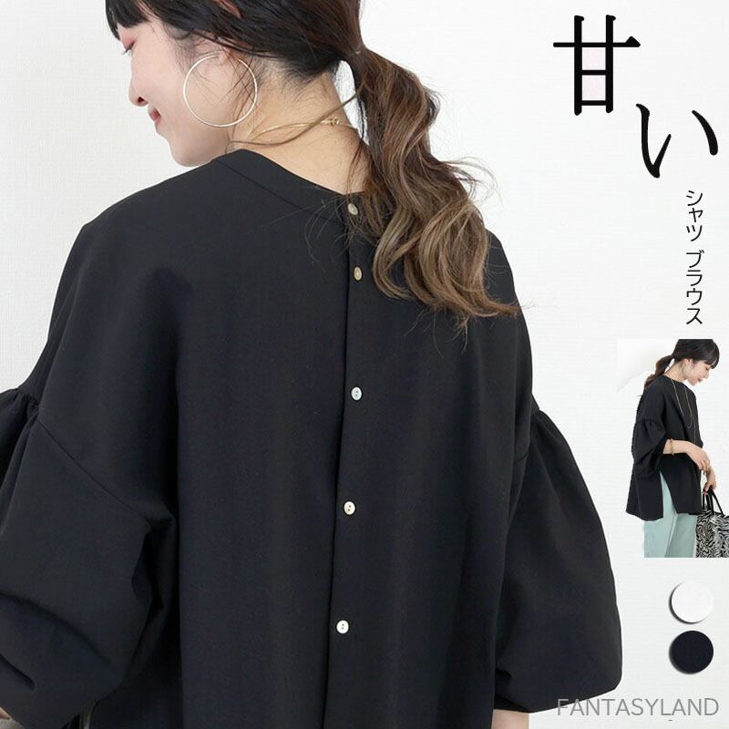 バックボタン ブラウス レディース ボリューム袖 ギャザー 袖ギャザー トップス シャツ 春秋冬 長袖 フレンチスリーブ 前後で着られる ゆったり きれいめ シンプル 柔らか 30代40代50代 フリー ブラック ホワイト 送料無料