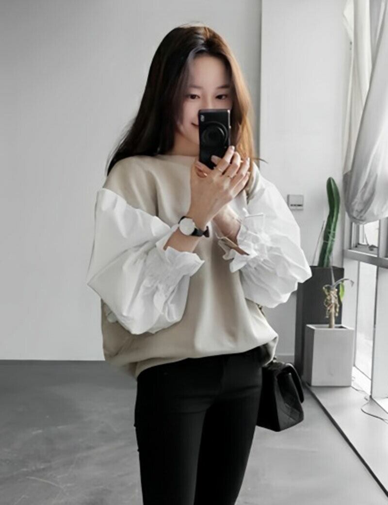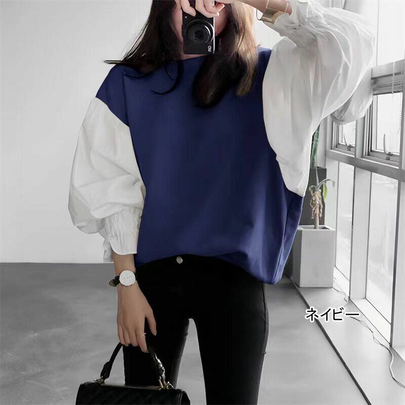 トップス レディース 異素材 大人 上品 ブラウス ドッキング キャンディースリーブ 切り替え 長袖 ラウンドネック Tシャツ ブラウス プルオーバー おしゃれ 可愛い 春 夏 秋 韓国 韓国ファッション 20代 30代 40代 50代 送料無料