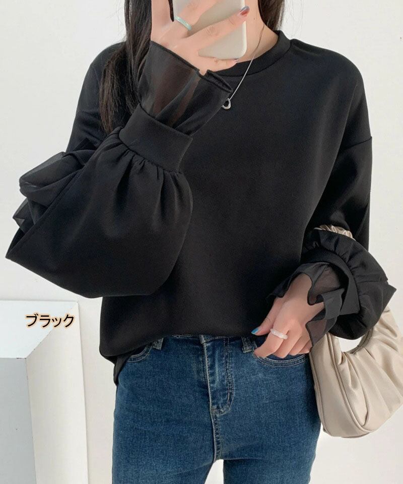 トップス レディース Tシャツ 大人 上品 長袖 異素材 切り替え ドッキング キャンディースリーブ ラウンドネック プルオーバー おしゃれ 可愛い 春 夏 秋 韓国 韓国ファッション 20代 30代