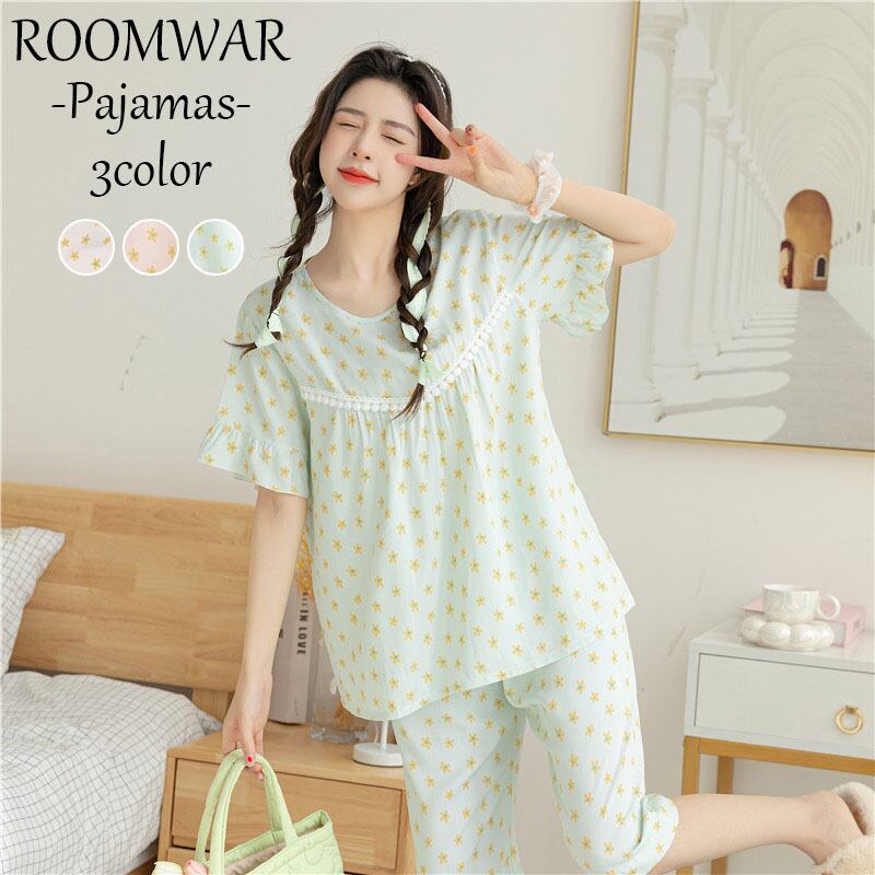 商品説明 綿のレディースの半袖パジャマ上下セット。ボトムは膝下の5分丈程度。