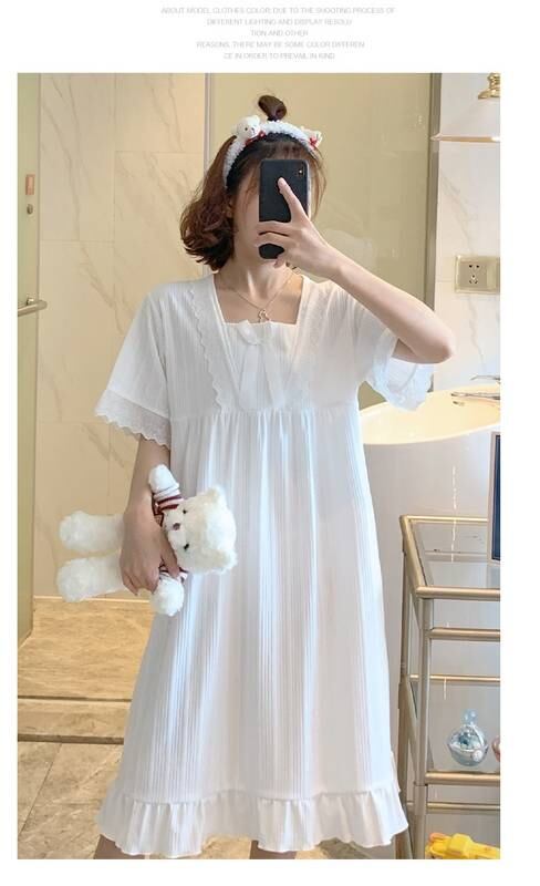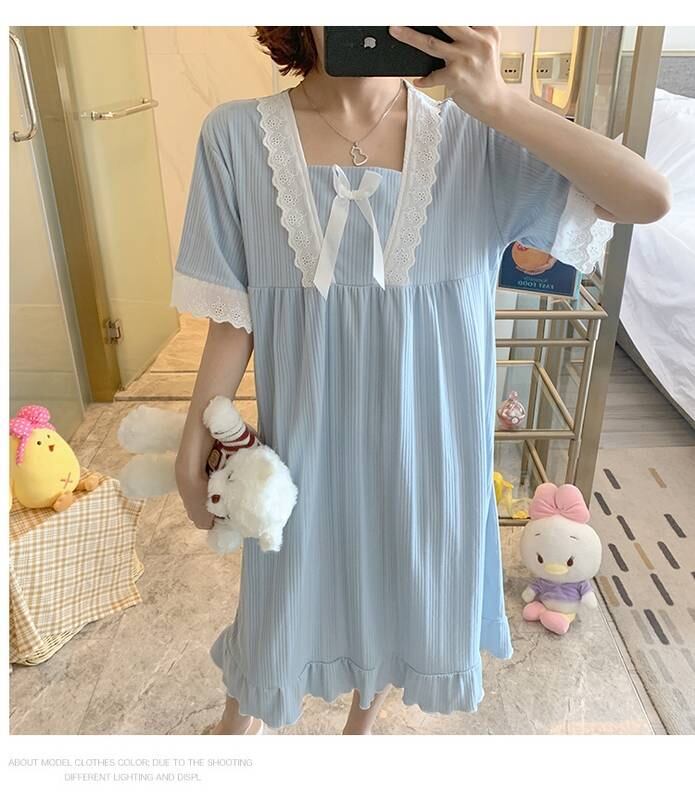 パジャマワンピ 夏 レディース ネグリジェ 半袖 スクエアネック リボン レース ひざ丈 裾フリル 無地 10代 20代 30代 ママ お泊り 休日 ルームウエア パジャマ