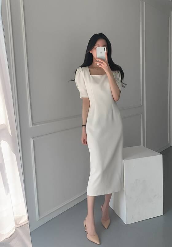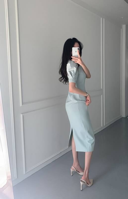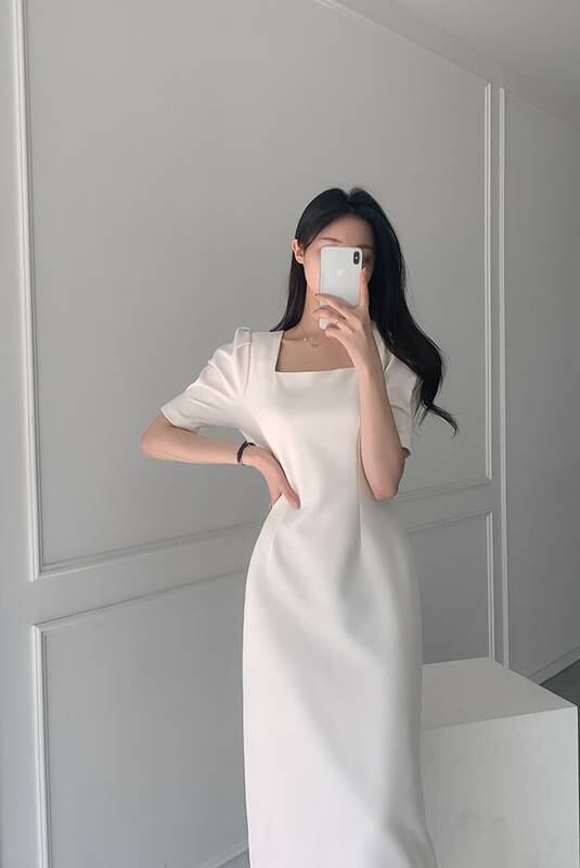 ワンピース レディース ドレス ロング ワンピ 半袖 ミモレ丈 夏 タイト スクエアネック スリット 無地 ホワイト 水色 2色展開 イベント お出かけ デート 結婚式 パー