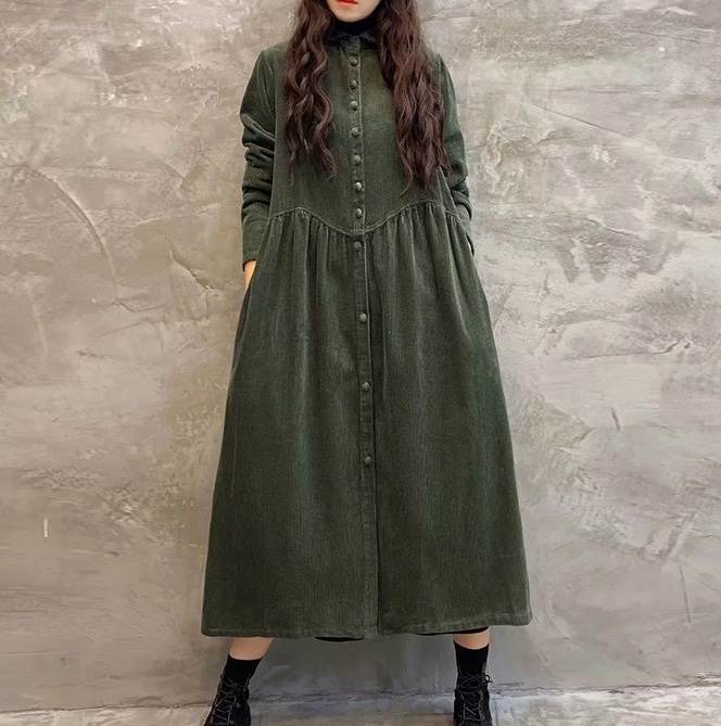 ワンピース レディース シャツワンピ フレア ロング Vネック 襟付き Aライン 前開き ボタン コーデュロイ かわいい 大人可愛い きれいめ シンプル カジュアル おしゃれ レトロ ガーリー ラブリー キュート アクティブ ナチュラル 無地 秋 冬 お出かけ 旅行 女子会 休日 ショッピング ライブ カフェ 重ね着 体型カバー 普段使い 着回し レイヤード トレンド 流行 インスタ映え M L XL 2XL 小さいサイズ 大きいサイズ 黒 ブラック 茶色 ブラウン 緑 グリーン モスグリーン キャメル