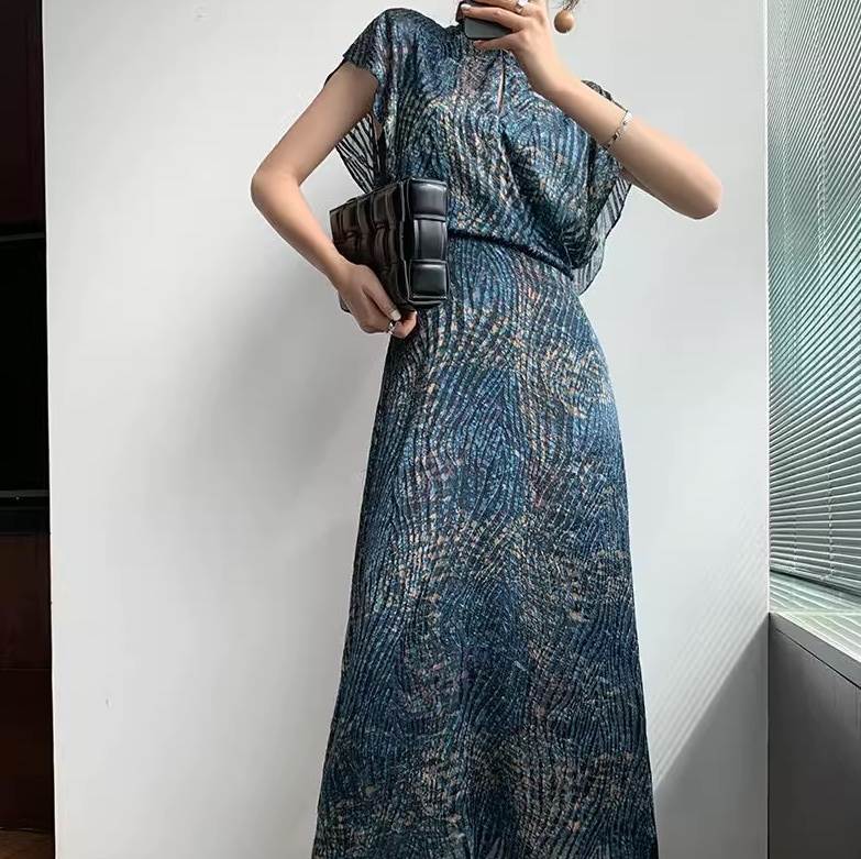 ワンピース フレア マキシ 9分丈 半袖 ハイネック フレア Aライン 切り替え 背中開き フェミニン プリーツ ウエストマーク バックコンシャス 透け感 シースルー ヴィンテージ 薄手 かわいい 大人可愛い 上品 おしゃれ 個性的 クール モード系 都会的 マーブル 総柄 春 秋 謝恩会 結婚式 二次会 披露宴 発表会 ママ お出かけ パーティー イベント 海 レストラン ビーチ 休日 バカンス カフェ 体型カバー 美脚 脚長 着回し インスタ映え S M L 小さいサイズ 大きいサイズ ブルー 青色