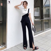 オールインワン レディース ストラップ パンツ サロペット ポケット 無地 ストレート Iライン スリット お洒落 主役級 存在感 シンプル こなれ感 オルチャン 韓国 オー