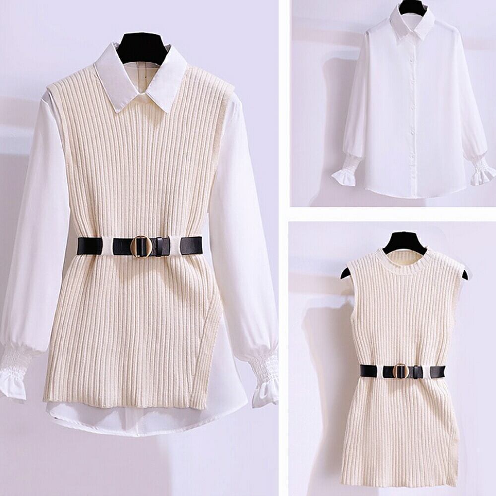 レディース ニット コーデセット ベスト 白シャツ ブラウス トップス セーター シンプル カジュアル チョッキ ラウンドネック ベルト付き 3点セット