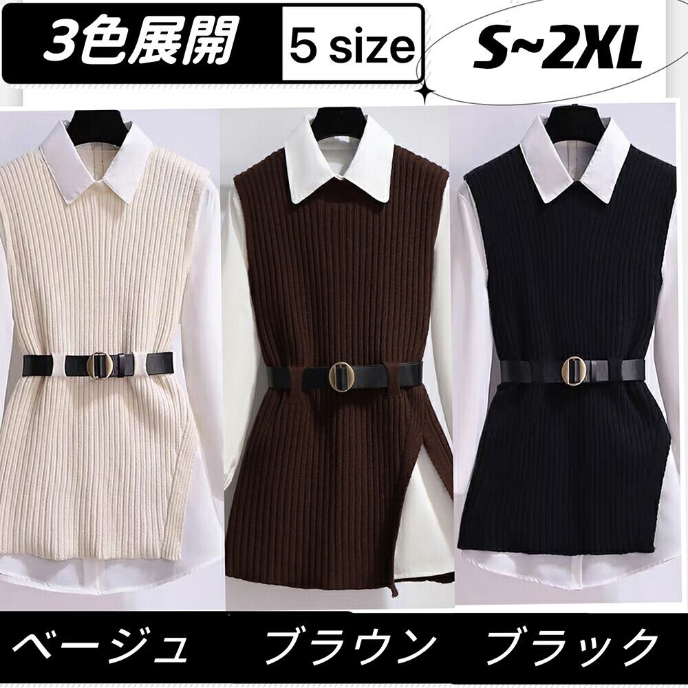 【XL】肩幅37cmバスト90cm総丈69cm 【2XL】肩幅38cmバスト92cm総丈70cmその他商品説明 大注目の大人なニットベストと襟付きの白シャツの2点セットが登場♪ 流行に流されることのない定番アイテムをあなたのワードローブに。ベーシックなラウンドネックのデザインなので、襟付きのトップスでコーデするだけで上品なかわいらしさを演出できる。シンプルなデザインで、様々なトップスと合わせ自由自在でオールシーズン使用できる。定番として活躍してくれるブラック、着回し力の高いベージュ、落ち着いて知的な雰囲気にまとまるくすみブラウンの3色ご用意させて頂きます。シンプルな色合いのため、どちらも使い回しやすい仕上がりです。クルーネック、サイドスリットはキャリアウーマンの雰囲気が良いです。ベルト付きのデザインで、程良く絞ったウエストラインが女性らしく演出。デニムとパンツと合わせたカジュアルコーデはもちろん、スカートに合わせたフェミニンコーデにも☆これからの季節に長く愛用できるアイテム☆注意 ※すべて平置きサイズです。採寸方法違いより、多少の誤差がございますので、ご了承ください。