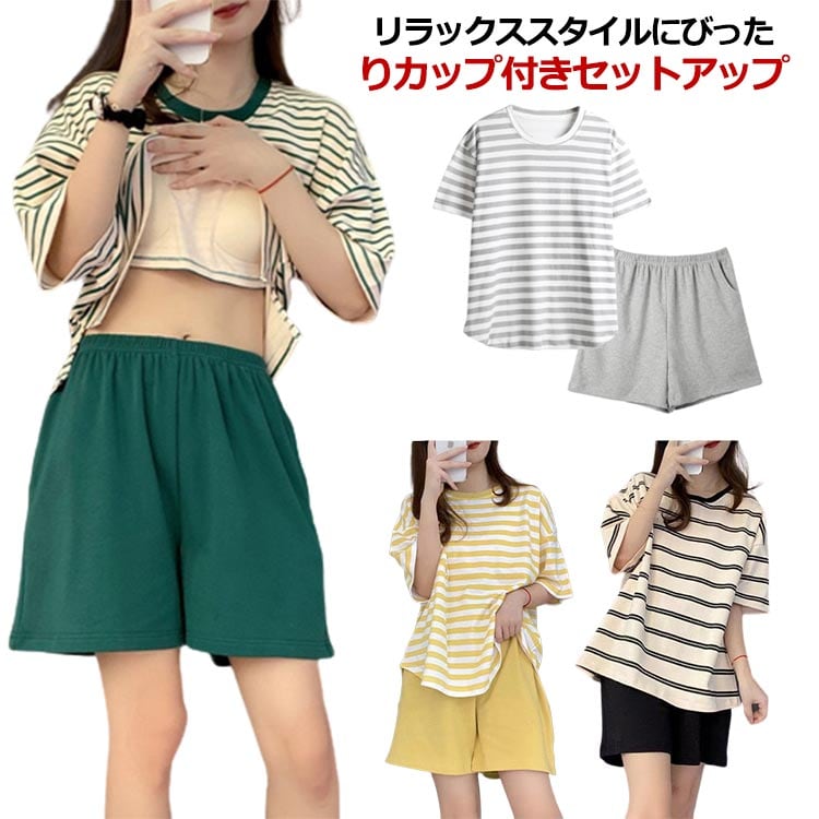 パジャマ ボーダー柄 春 パット付き 半袖 チェック柄 柄 ルームウェア ショートパンツ リラック カップ付き 夏 春夏 夏用