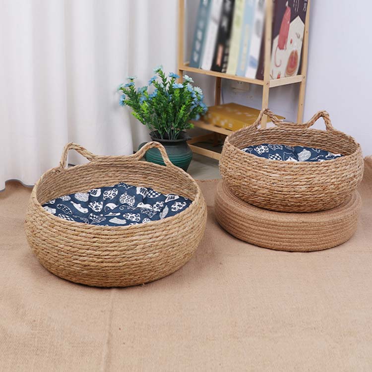 かわいい猫耳デザインの籐編み猫ちゃん・ワンちゃん用ベッド