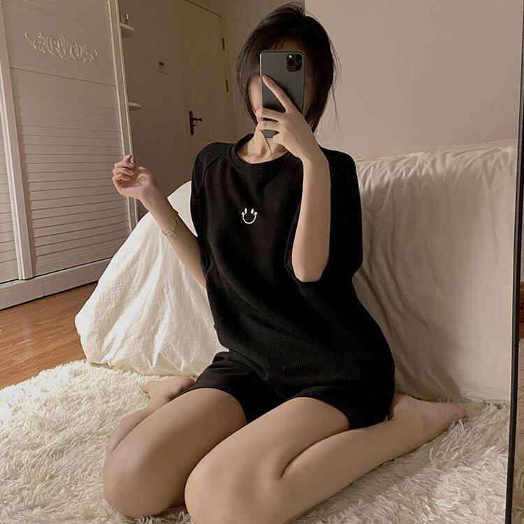 レディース 夏 セットアップ ワッフル生地 プルオーバー Tシャツ 刺繍 スマイル ワンポイント 半ズボン 部屋着