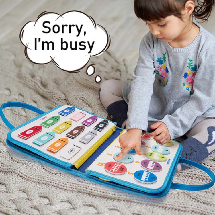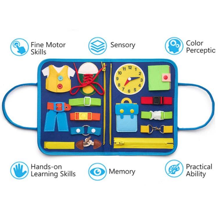 豊かなボタン、バックル、靴紐、ジッパーなどで遊べる、「ビジーボード」と呼ばれる知育用玩具です。