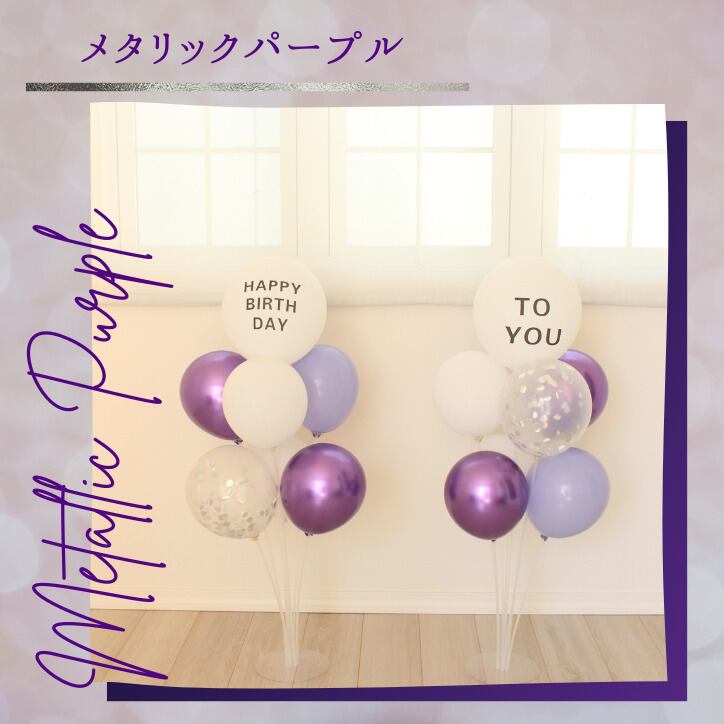 HAPPY BIRTHDAY、TO YOUの文字がデザインされた30cmのレターバルーン各1個、25cmのメタリックバルーン4個、カラーバルーン、ホワイトバルーン、コンフェッティバルーンは各3個づつ、バルーンスタンド2本、ハンドポンプ 1本がセットになった特別なバルーンセットです。大切な誕生日や記念日を華やかに飾り付け、お祝いの雰囲気を一層盛り上げることができます。