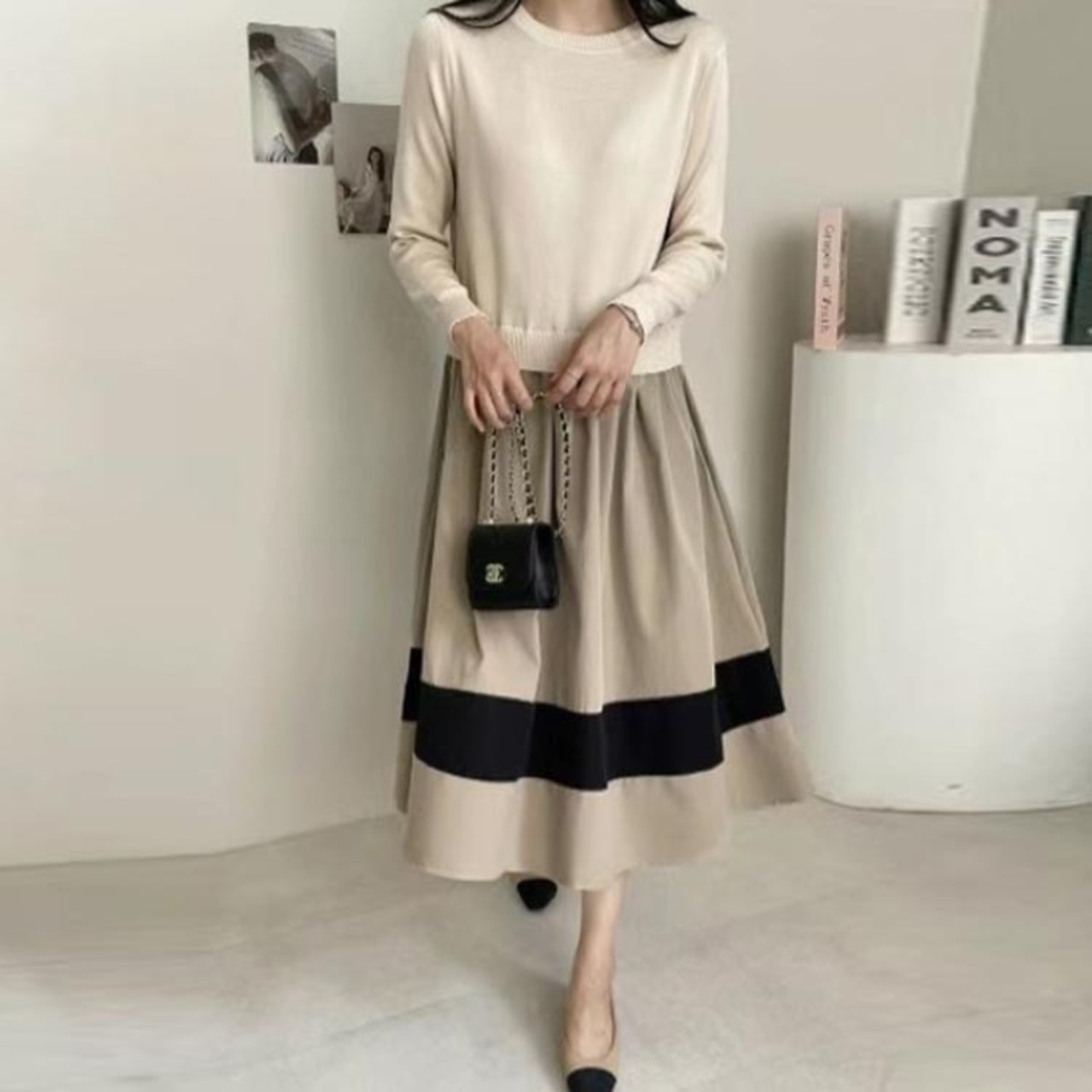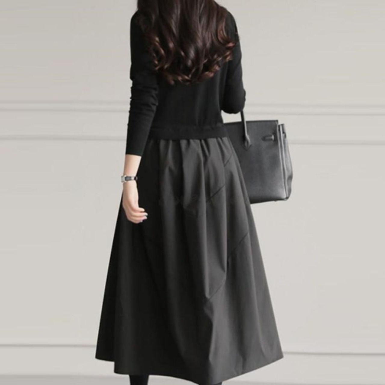 切り替え ワンピース ニット フレア 春 秋冬 きれいめ 切り替えワンピース レディース クルーネック 膝下丈 フレアワンピース