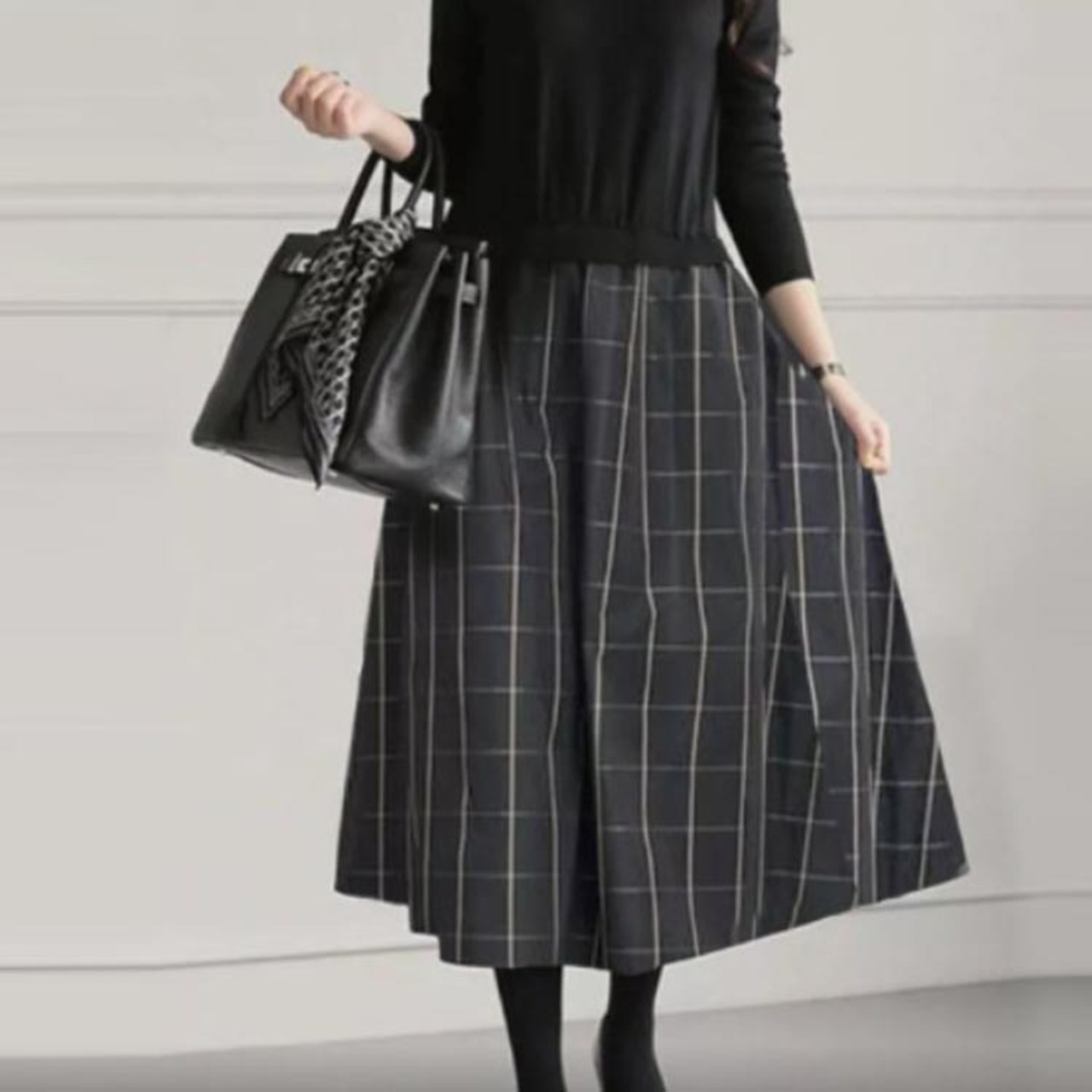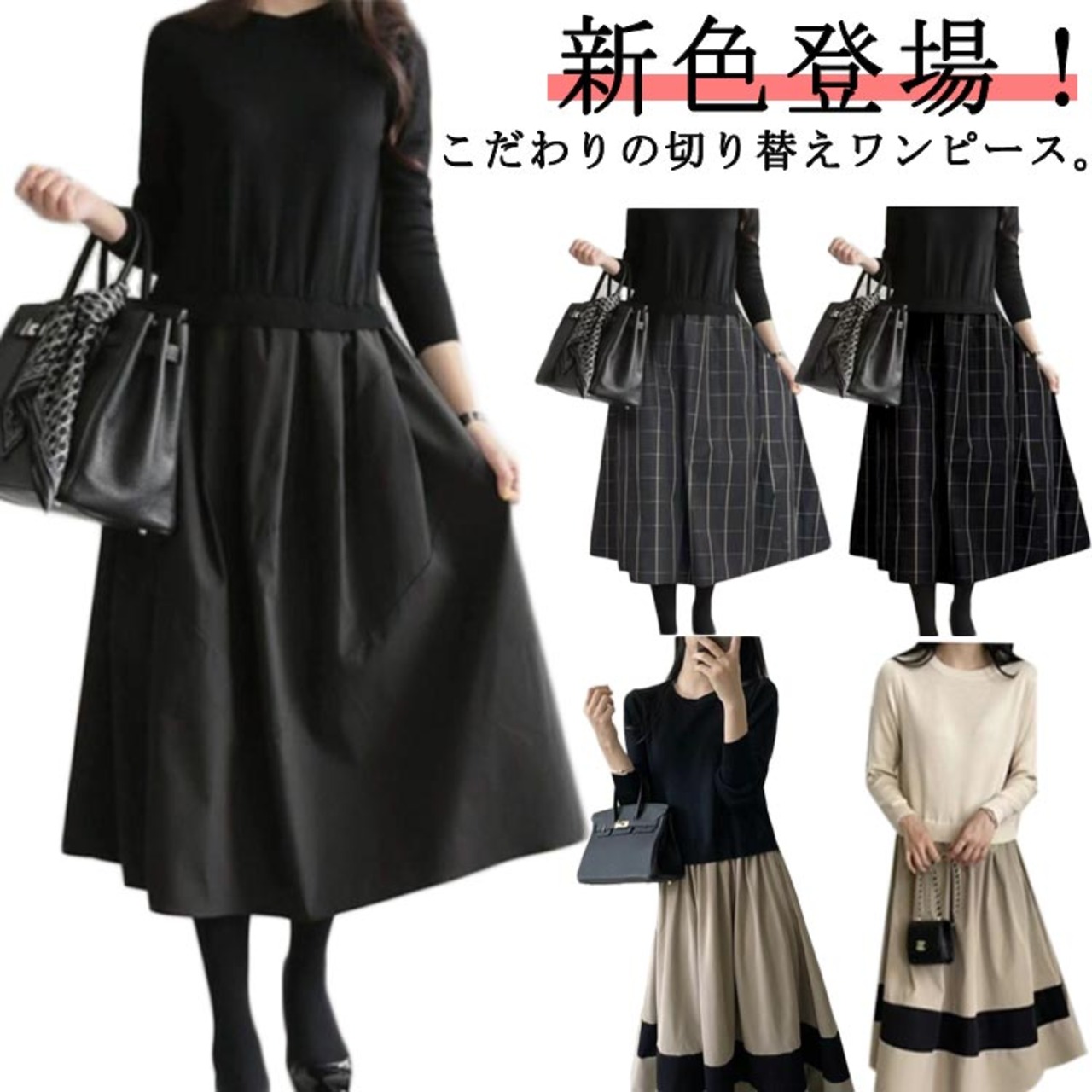 切り替え ワンピース ニット フレア レディースファッション 割引カラー: 無地 チェックグレー 切り替えグレー 切り替えベージュ チェックブラック