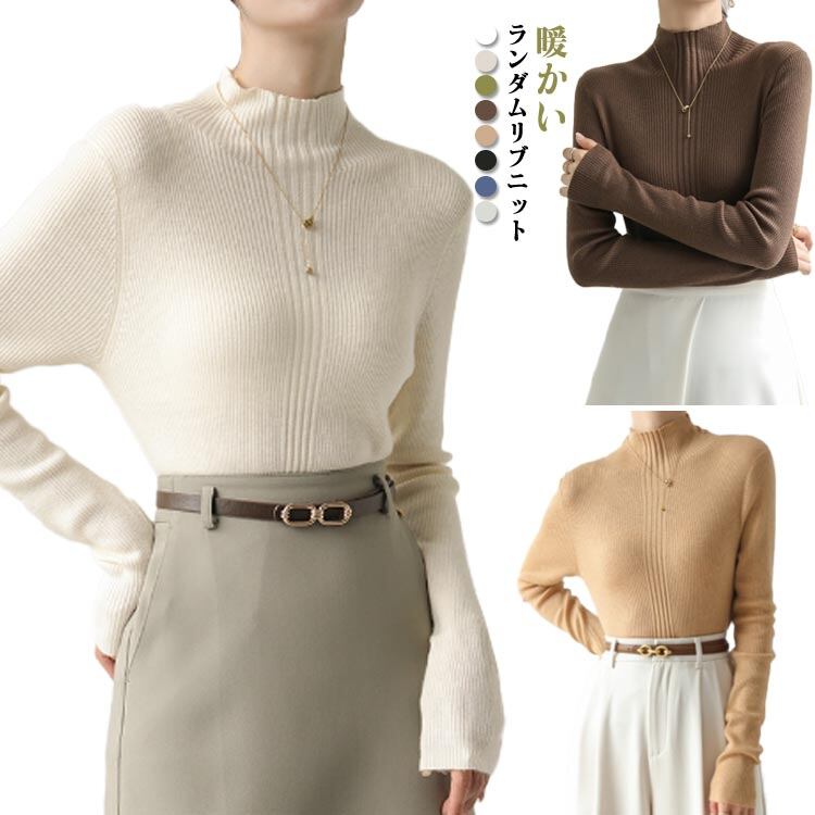 ランダムリブニット トップス ニット レディース 冬 秋 長袖 リブ リブニット ハイネック プチハイネック モックネック 無地 きれいめ 細身 タイト