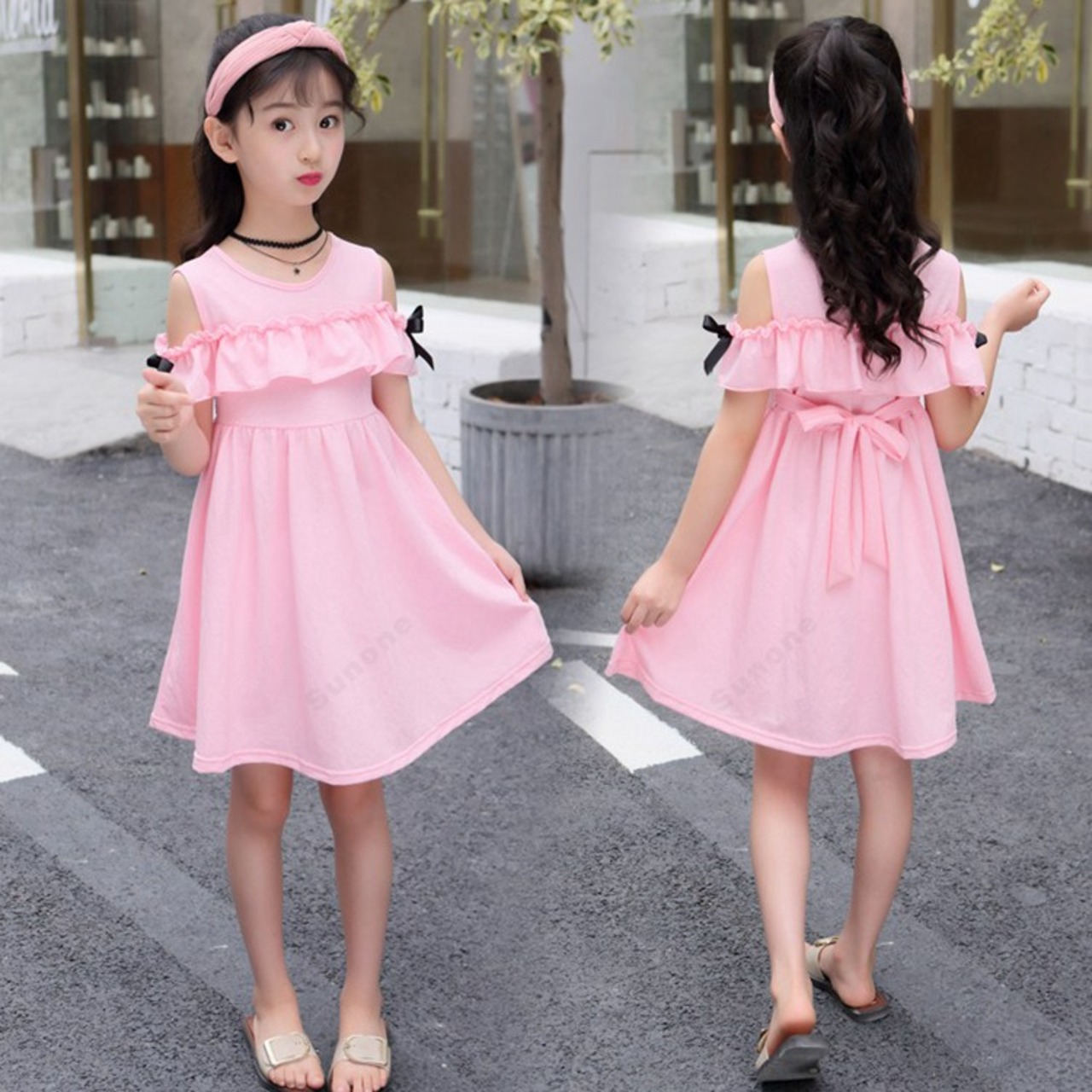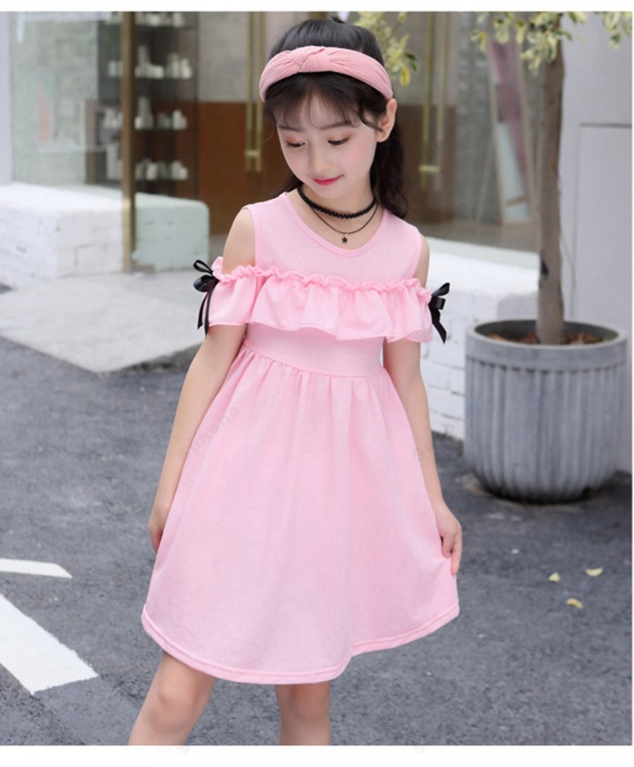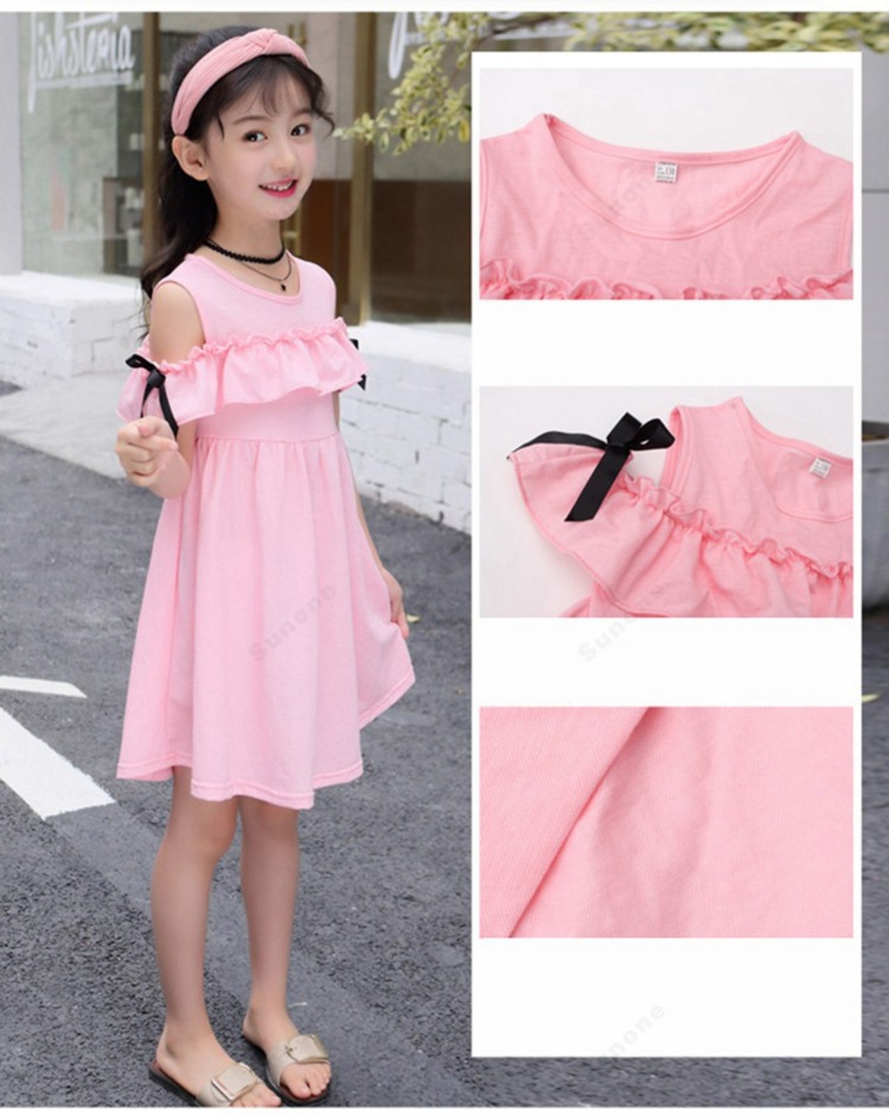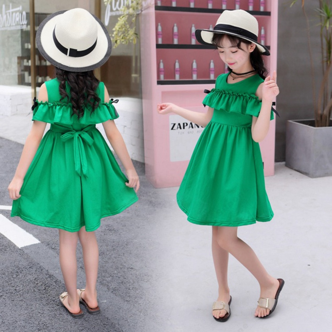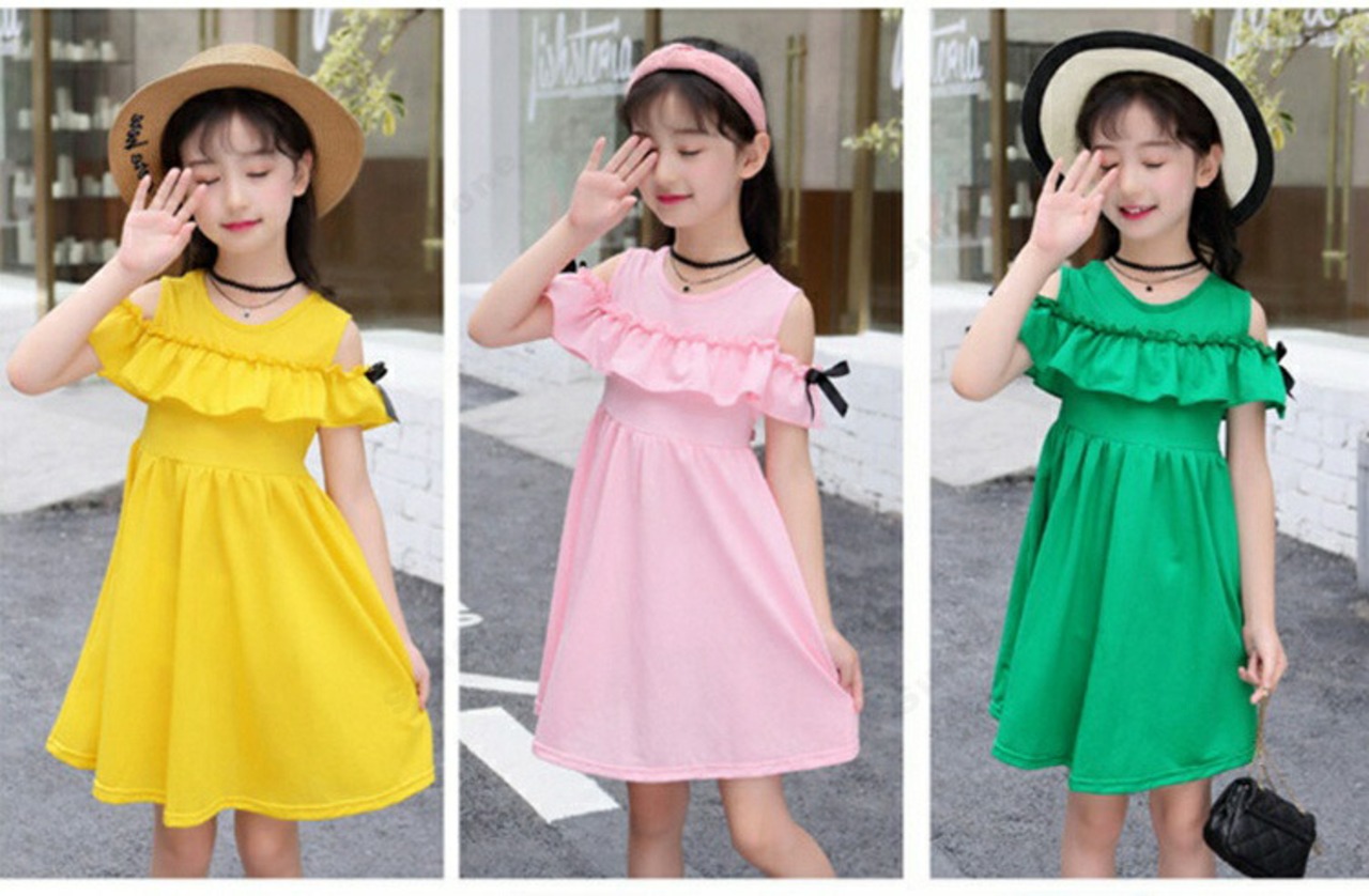 子供服 イエロー グリーン ピンク 袖フリルワンピース リボン付ワンピース オフショルダー 可愛い 子ども 小学生 お出かけ ワンピース 女の子 ガールズ 夏ワンピ 無地 かわいい