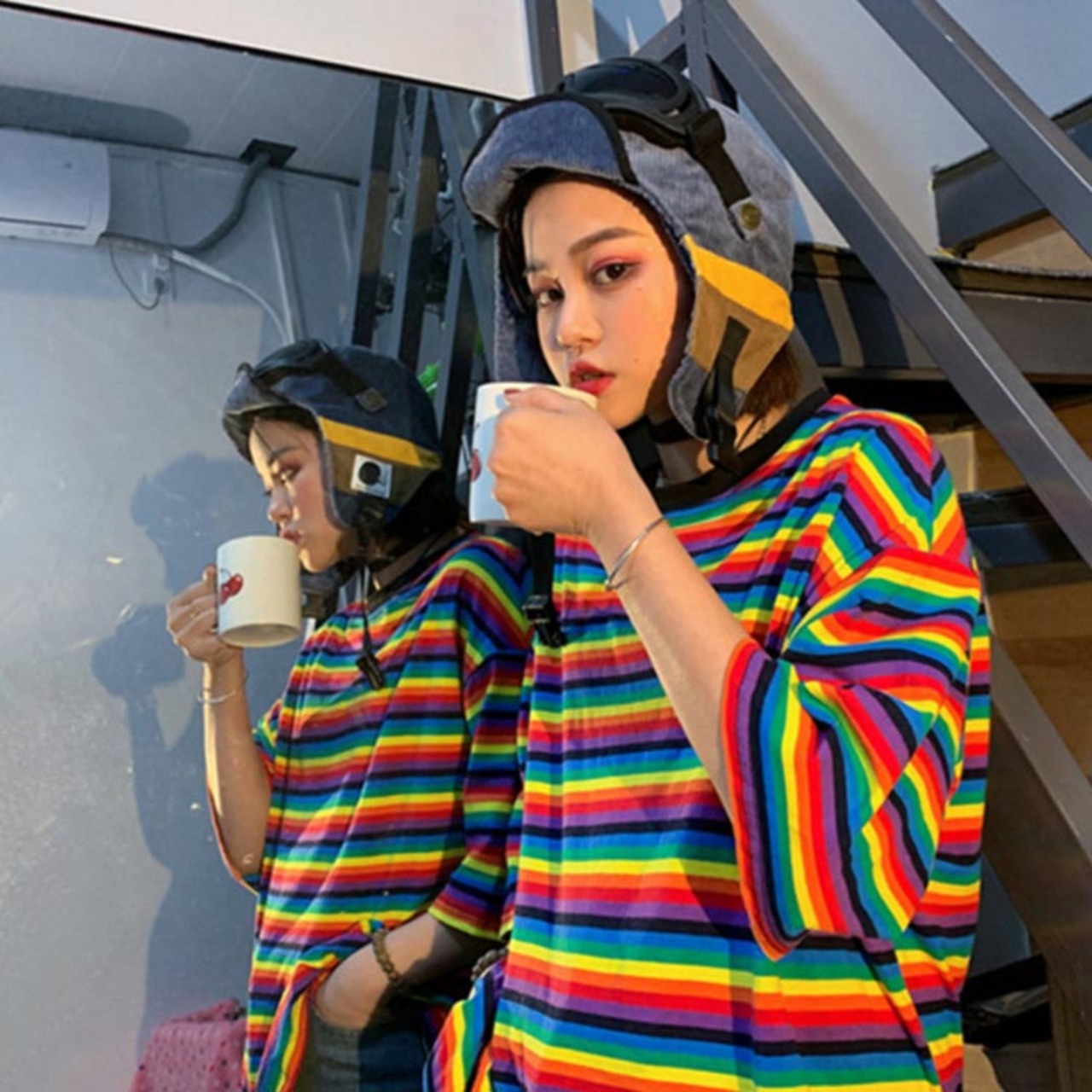レインボー ボーダー Tシャツ ロング ゆるTシャツ トップスレディースファッション トップス Tシャツ カットソー